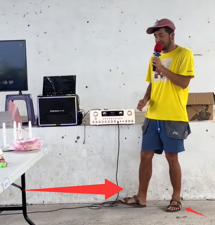 最吸睛的还是他脚上的拖鞋,就是那种最常见的塑胶款,颜色暗沉,鞋头还有点磨损,妥妥的爸爸辈穿的款式,估计在村里随便找个大叔都能看到同款。