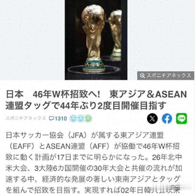 日前,日本正在筹备2046年世界杯亚洲区联合申办草案,包括韩国、中国以及东南亚等国悉数在列。