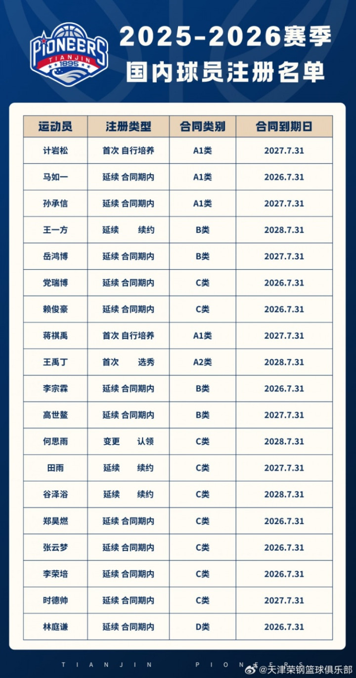 原文写道:“[官宣]经CBA公司审核并完成注册公示,天津荣钢篮球俱乐部已完成2025-2026赛季CBA联赛国内球员注册工作。新赛季先行者将继续秉承“自强不息、奋斗不止、永不言败”的荣程精神,全力以赴迎接每一场比赛,向新的目标发起冲击!”