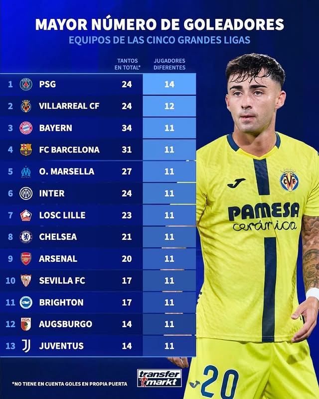 比利亚雷亚尔:24球,12名球员