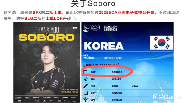 Soboro是BFX二队上单,有一段时间,在一队打过替补,实力只能说很一般,上个月刚结束的ECA亚洲公开赛,打BLG二队的时候被单杀过,之前打联赛,也是被多兰各种单杀,而且年龄跟Bin哥一样大,IG买他应该没啥说法,估计只是用来过渡一下,等TheSh休整好了,就下放替补席。